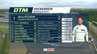 BMW Motorsport Pilot Marco Wittmann hat sich hier im verregneten Hockenheim die erste Pole Position der DTM Saison 2019 geholt. Rang zwei geht an den Audi Sport Fahrer Mike Rockenfeller, vor dem Sensationsdritten, Paul di Resta im Aston Martin