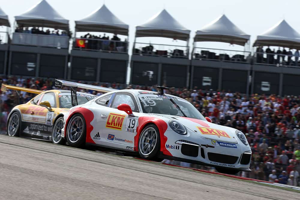Der neue Carrera Cup Deutschland Champion ging nach zwei Runden an Polesetter Earl Bamber vorbei und übernahm die Spitze. Der Österreicher sah schon wie der sichere Sieger aus als er knapp vor Schluss angerempelt wurde und dadurch zwei Positionen einbüßte.