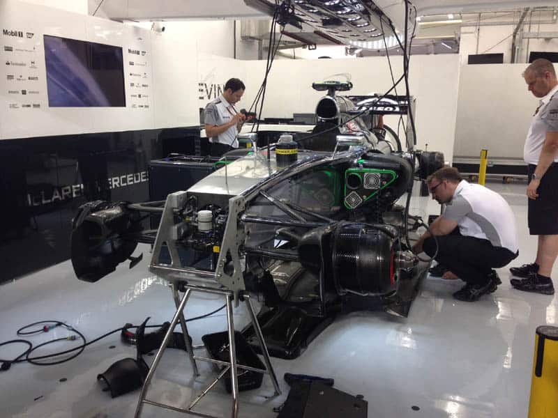 Das führende Mercedes Team scheint, mit dem Einbau eines Ladeluftkühlers eine Geheimwaffe gefunden zu haben. Dieser ist im Vorderteil des Chassis eingebaut. Dieser Ladeluftkühler kühlt den Luftstrom vom Turbo zum Motor. Luft von unterhalb des Autos wird in den Ladeluftkühler gesaugt , um den Kompressionsdruck zu erhöhen. Dies steigert die Leistung, da kühle Luft ein geringeres spezifisches Gewicht als warme hat. Dies stellt einen wesentlichen Vorteil für die Leistung eines Mercedesmotors dar und wird von den anderen Teams nur schwer kopierbar sein.